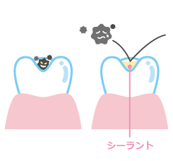 シーラントとは奥歯の溝の部分に溝を埋めるための材料を接着し、虫歯を予防する方法です。シーラントはその性質上、虫歯の出来やすい場所、出来やすい時期に行う事が望ましく、一般的には子供の第1大臼歯に施されることが多いです。歯ブラシの毛先が届きにくく、虫歯になりやすい複雑な歯の溝に対して効果的な予防法です。